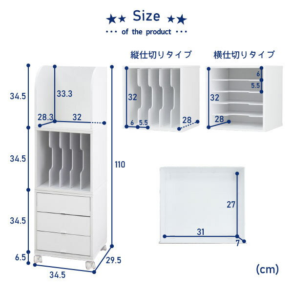●マルチスタンド 【外寸サイズ】 幅34.5cm×高さ34.5cm×奥行29.5cm、板厚12mm 【内寸サイズ】 幅32cm×高さ33.3cm×奥行28.3cm 【材質】 プリント化粧板パーティクルボード 【生産国】 ベトナム ●ボックス(仕切り) 【外寸サイズ】 幅34.5cm×高さ34.5cm×奥行29.5cm、板厚12mm 【内寸サイズ】 幅32cm×高さ32cm(仕切り間隔中央3か所5.5cm、6cm)×奥行28cm 【本体耐荷重】 10kg 【材質】 本体:プリント化粧板パーティクルボード 仕切り:ABS樹脂 【生産国】 本体:マレーシア 仕切り:日本 その他樹脂機構部品:日本 ●ボックス(引き出し) 【外寸サイズ】 幅34.5cm×高さ34.5cm×奥行29.5cm、板厚12mm 【内寸サイズ】 幅32cm×高さ32cm(トレー間隔4cm)×奥行28cm 【本体耐荷重】 10kg 【引き出し内寸】 幅31cm×深さ7cm×奥行27cm 【材質】 本体:プリント化粧板パーティクルボード 引き出し:ポリカーボネート、ポリプロピレン 【生産国】 本体:マレーシア 引き出し:日本 その他樹脂機構部品:日本 ●キャスター台(キャスター×4(うちストッパー付き×2)) 【外寸サイズ】 幅34.5cm×高さ6.5cm×奥行29.5cm 【耐荷重】 65kg以下 【材質】 本体:プリント化粧板パーティクルボード キャスター:ナイロン 【生産国】 日本 【セット内容】 マルチスタンド×1 ボックス(仕切り)×1 ボックス(引き出し)×1 キャスター台×1 【外寸】 幅34.5cm×高さ110cm×奥行29.5cm 【付属品】 連結用ダボ×16、仕切り用ネームシール 【組み立て】 完成品(ボックスの連結はお客様でお願いいたします) 【備考】 ※製品に乗ると大変危険ですのでおやめください。